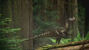 An Ornitholestes was seen eating an hatched Diplodocus sauropodlet, whilst the remaining babies emerged from the soil, the carnivore watched as it already ate its fill. Later, the same Ornitholestes passed by the Diplodocus creche which was hiding in the undergrowth.