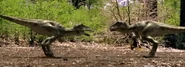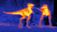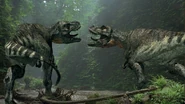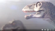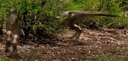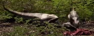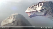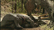 Elsewhere, a male Tyrannosaurus scavenges the carcasses of dead animals that were killed by carbon monoxide released into the atmosphere by volcanic vents in the area. He nearly falls victim to the poisonous gasses being released into the atmosphere, but he manages to snatch a the carcass of a juvenile Tyrannosaurus because his height keeps him above the layer of the carbon monoxide. Another male, possibly the same male who was scavenging, responds to the female Tyrannosaurus' calls by killing a Triceratops for her. She likes her gift and the two initiate the mating period.