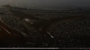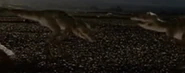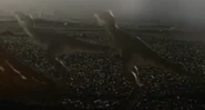 The male T. rex approaches a herd of Anatotitan, scaring many of the herd's members with the goal of pressuring the herd into giving up any individuals weakened by sickness or injuries. Several males confront him to defend their herd so tries to find another way around the large males, but the fog around him thickens so he decides to forgo attacking due to the risk involved.