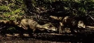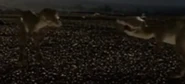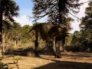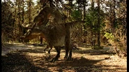 The T. rex bites the bull in one of his flanks, tearing off 65 pounds of flesh in the process. Unable to find the herd he belongs to, the Torosaurus attempted to charge at his attacker, only to stumble from the great pain he felt. The male Torosaurus then decides to run to find his herd, only for the Tyrannosaurus follows in pursuit and bites his flank again, shattering the herbivore's hip bone in the attack. With his prey pinned down and dying, the male calls out to the female he has been wanting to attract.